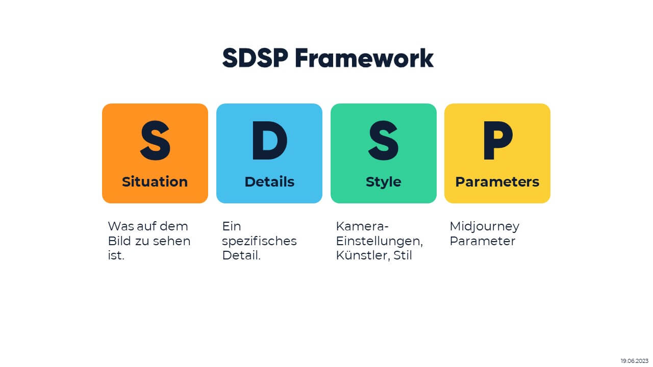 Das SDSP-Framework ist ein leistungsstarker Input. Es steht für Situation, Details, Style und Parameter. Mit diesem Framework kannst du den Kontext eines Bildes (Situation), spezifische Informationen rund um das dargestellte Objekt (Details), die künstlerische Darstellung und Kameraeinstellung (Style) sowie die relevanten Midjourney Parameter (Parameter) systematisch erfassen und verstehen.