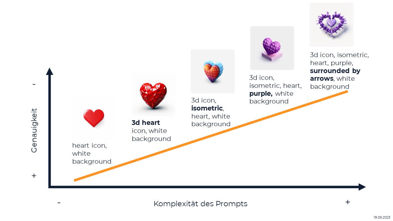 ChatGPT und Midjourney sind zwei KI-Tools, die wir unterdessen tagtäglich einsetzen. Anhand der nachfolgenden Abbildung ist gut zu erkennen, wo die Grenzen von den Systemen sind. Je komplexer der Prompt, also die Eingabe, desto weiter ist das Ergebnis weg vom gewünschten Resultat.