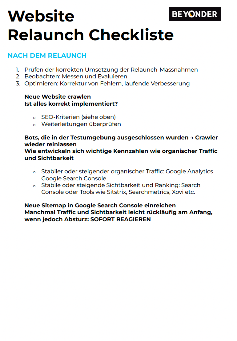 Nach dem Relaunch solltest du die korrekte Umsetzung der Relaunch-Massnahmen prüfen, indem die Website gecrawlt wird. Sind die SEO Kriterien und Weiterleitungen implementiert? Bots, die in der Testumgebung ausgeschlossen wurden, sollen wieder reingelassen werden.