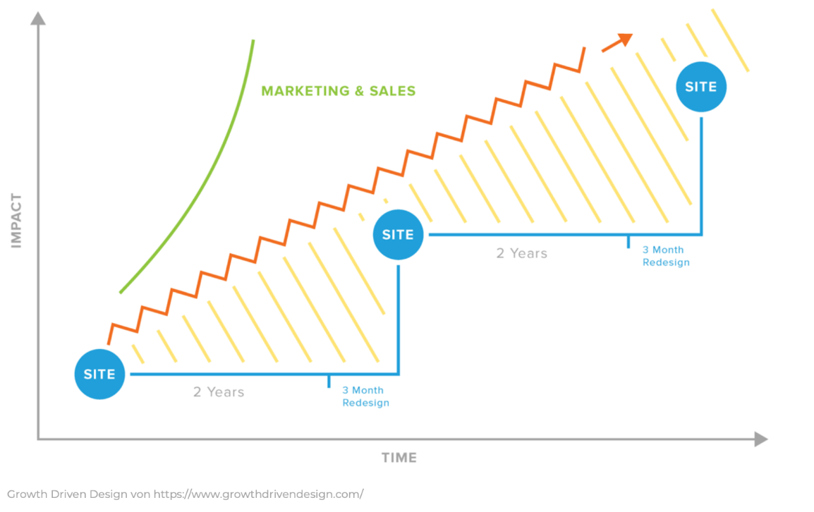 Ebenso ein wichtiger Teil der Projektplanung ist die Zeitplanung. Da eine Website immer ein komplexes Produkt ist, eignet sich eine klassische Wasserfallplanung unserer Meinung nach nicht. Das Konzept des Growth Driven Designs ist viel besser dafür geeignet. Es gibt unterschiedliche Arten der Umsetzung, im Wesentlichen geht es darum kein Killerprojekt daraus zu machen und dann drei oder mehr Jahre an der Website zu arbeiten. Sondern die Website nicht als abgeschlossenes Projekt anzusehen und sie stetig weiterzuentwickeln. Dies verringert das Risiko eines Fehlschlags und sieht in etwa so aus: