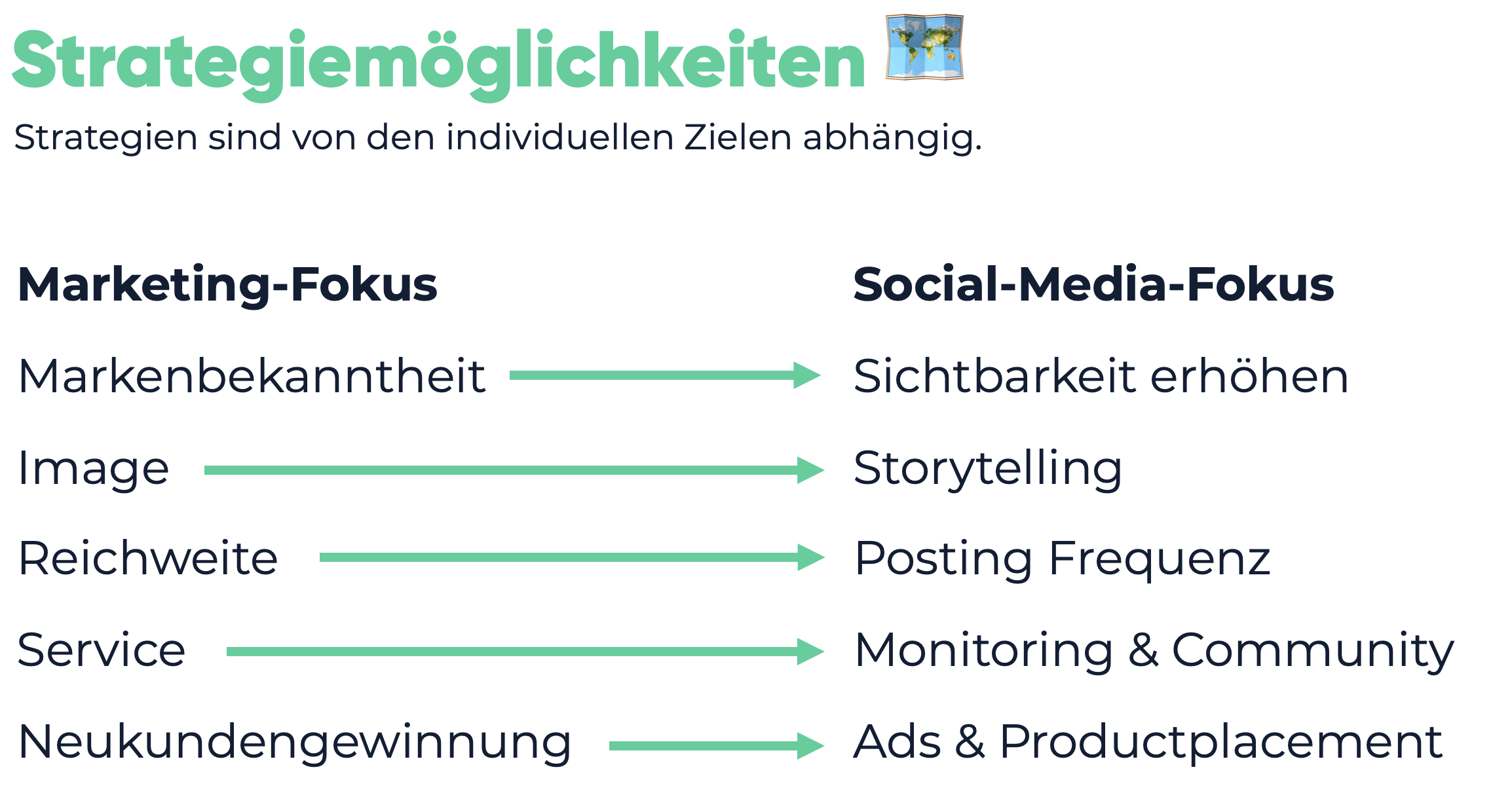 Die individuellen Ziele bestimmen die digital Marketingstrategie, beziehungsweise den Marketing-Fokus. Das jeweilige Ziel richtet wiederum den Social-Media-Fokus aus.