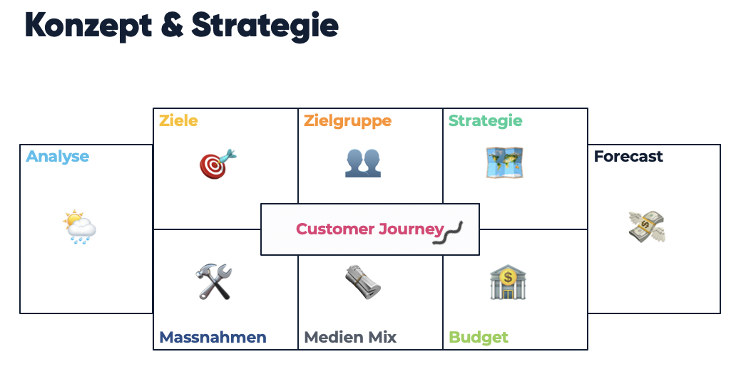 Mit diesen drei Eckpfeilern erstellst du ein Konzept. Dieser Plan zeigt dir nicht nur auf, was du für die Strategieerstellung machen musst. Er hilft dir auch bei der Analyse der ersten Schritte hin zu deiner Online-Marketing-Strategie. Von diesem Plan aus geht es direkt zur Umsetzung.