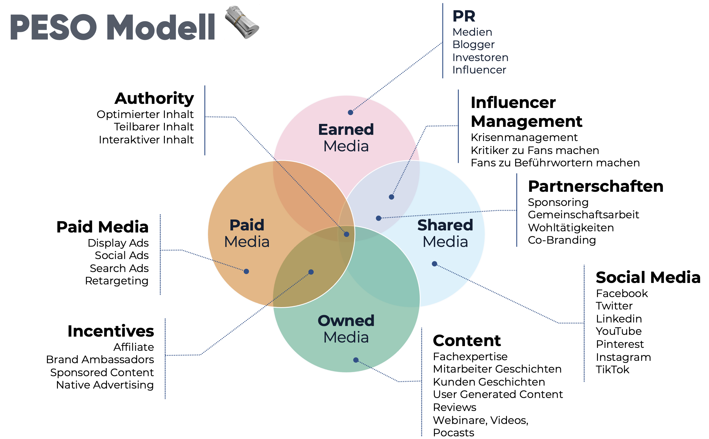 Sinn und Zweck ist es, die einzelnen Medien zu koordinieren und aufeinander abzustimmen. Die vier Hauptkategorien sind Paid Media (Display Werbung, Suchmaschinenwerbung), Earned Media (PR, Suchmaschinenoptimierung), Shared Media (Social Media organisch) und Owned Media (Onpage Suchmaschinenoptimierung). Diese kannst du anhand des PESO-Modells gut sichtbar machen und ausrichten.