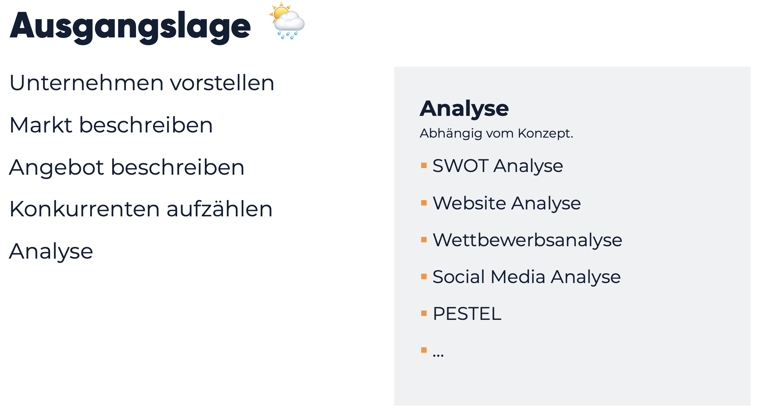 Hier geht es im Grunde darum, den Istzustand zu Papier zu bringen. Um die Ausgangslage zu definieren, gilt es, dein Unternehmen vorzustellen, den Markt sowie das Angebot zu beschreiben, deine Marktbegleiter aufzulisten und all das dann abhängig vom Konzept zu analysieren.