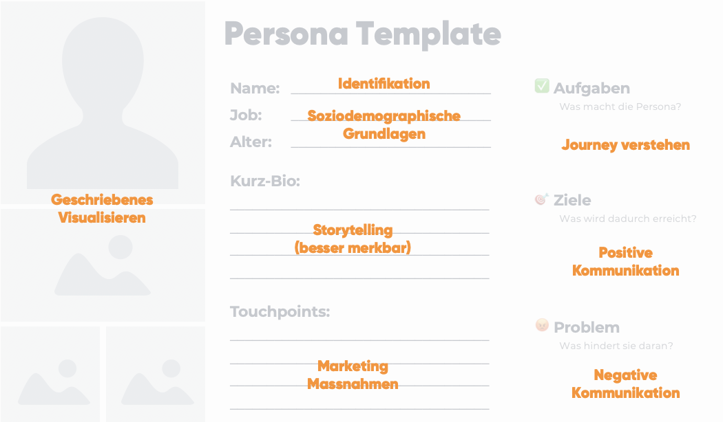 Vergesst Zielpersonen! Das hört sich nicht nur aggressiv an, sondern ist nicht mehr Zeitgemäss. Dabei geht eine Persona über soziodemografische Kriterien hinaus und gibt der Zielgruppe ein Gesicht, dass man sich besser merken kann. Am besten mit einem Persona-Templates. Das hilft besonders, wenn die individuelle Vorstellung der Zielgruppe innerhalb deines Teams sehr unterschiedlich sein kann. Die Personas dienen als wichtige Grundlage auch für weitere Massnahmen wie Werbung, Social Media, Suchmaschinenwerbung und Suchmaschinenoptimierung. Bei letzterem helfen Ziele und Probleme, die Suchintetion besser zu verstehen.