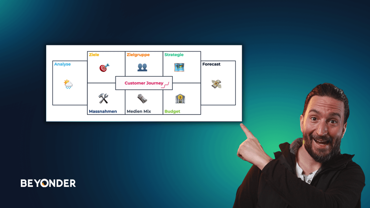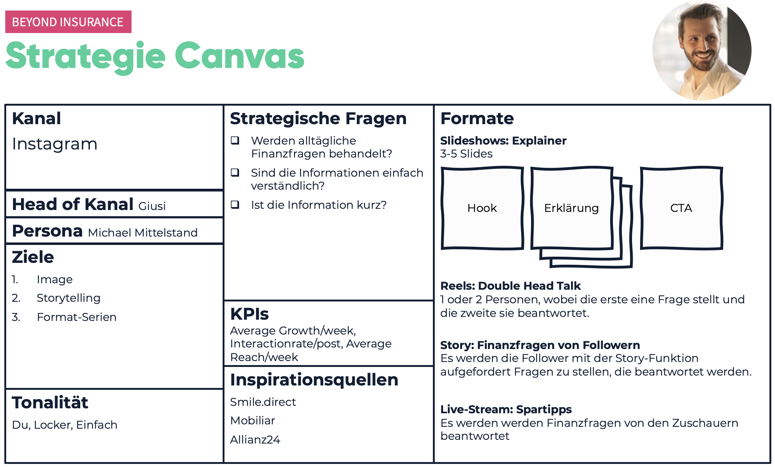 Tipp: Lege dir für jeden Social-Media-Kanal ein eigenes Digital Marketing Strategie Canvas an. Essenziell sind die strategischen Fragen, die du dir zu jedem Post stellen solltest. Nur wenn mindestens eine dieser Fragen bejaht wird, ist der Post für die Persona interessant. Bei BEYONDER sieht ein solcher Strategie-Canvas in etwa so aus: