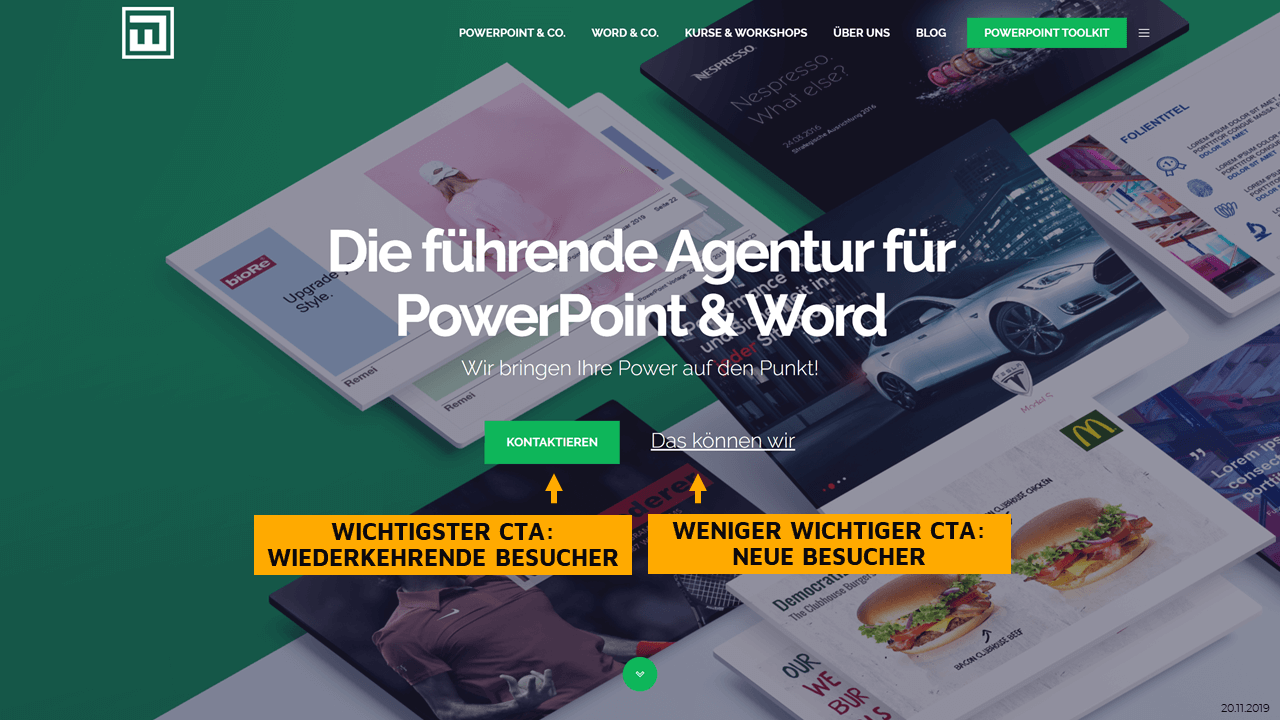 Wie oben erwähnt, erreichst du in diesem Abschnitt die meisten Besucher. Das ist eine Chance, aber gleichzeitig auch eine Herausforderung. Denn du musst es schaffen, einerseits erstmalige Besucher, die noch nichts über dein Unternehmen wissen, anzusprechen, andererseits sollten wiederkehrende Besucher möglichst schnell dorthin gelangen, wo sie hin möchten. Wie meisterst du diese Herausforderung?