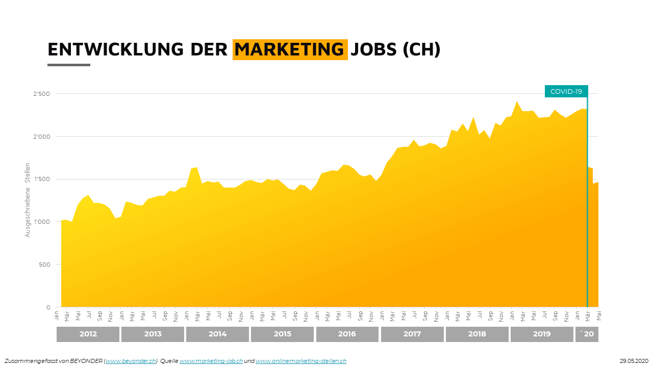 Wobei das Wort "Aufwind" der derzeitigen Entwicklung im Marketing-Jobsektor kaum gerecht wird. Es handelt sich viel eher um einen "Sturm nach oben". Im Vergleich vor fast 10 Jahren werden >130% mehr Marketing-Jobs ausgeschrieben. Wer also meint, dass Marketing ein Beruf ohne nennenswerte Zukunft sei, der ist an dieser Stelle um ein Besseres belehrt. Die COVID-19-Krise hat zwar zu einem massiven Rückgang geführt, aber werfen wir hierfür einen Blick auf ein paar Zahlen. In den nachfolgenden Diagrammen seht ihr alle die Entwicklung der Marketing- und Digital-Marketing-Stellen in der Schweiz. Darunter auch solche, die nicht auf Online-Jobportalen ausgeschrieben sind.