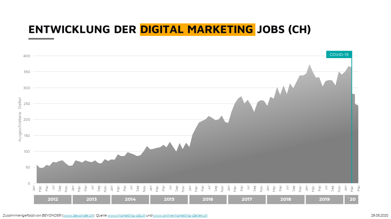 Rückblickend können auf die obere Auswertung können wir hoffen, dass sich der Markt allgemein wieder normalisiert. Digitales Marketing gehört auf jeden Fall nicht zu den grössten Verlierern. Aber lasst uns das Augenmerk wieder auf den Job-Markt legen.