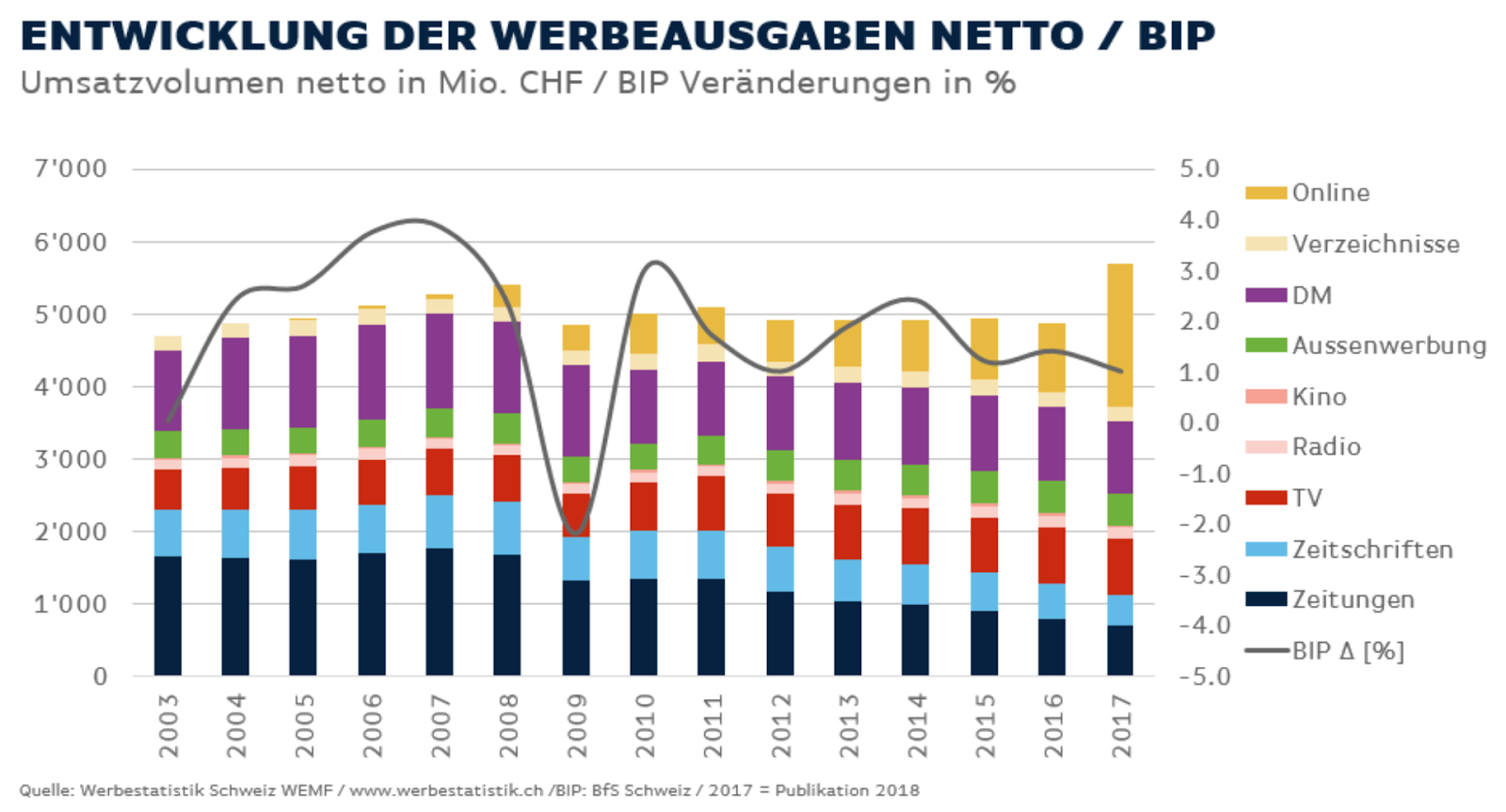 Die Entwicklung der Werbeausgaben kann man als Gradmesser für die Entwicklung des Marketings nehmen. Im Jahr 2017 haben die Online-Werbeausgaben erstmals so richtig zugelegt, wobei alle anderen Medien verloren haben. Und auch die letzte Krise ist zu erkennen. Das BIP hat in der Immobilienkrise 2009 drastisch abgenommen. Die Werbeausgaben hingegen haben sich zwar reduziert, aber nicht im selben Ausmass.