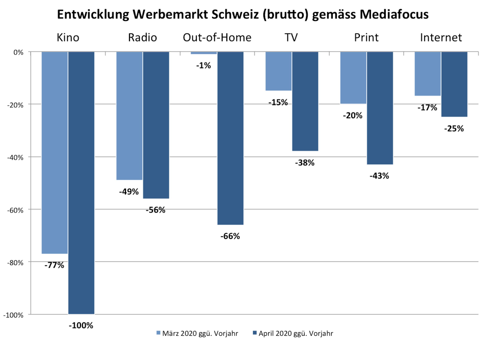 Lasst uns zur aktuellen Situation einen Blick auf die aktuelle Erhebung von Mediafocus werfen. Aktuell sind die Werbeausgaben drastisch zurückgegangen, TV- und Internet-Werbung haben jedoch am wenigsten eingebüsst: