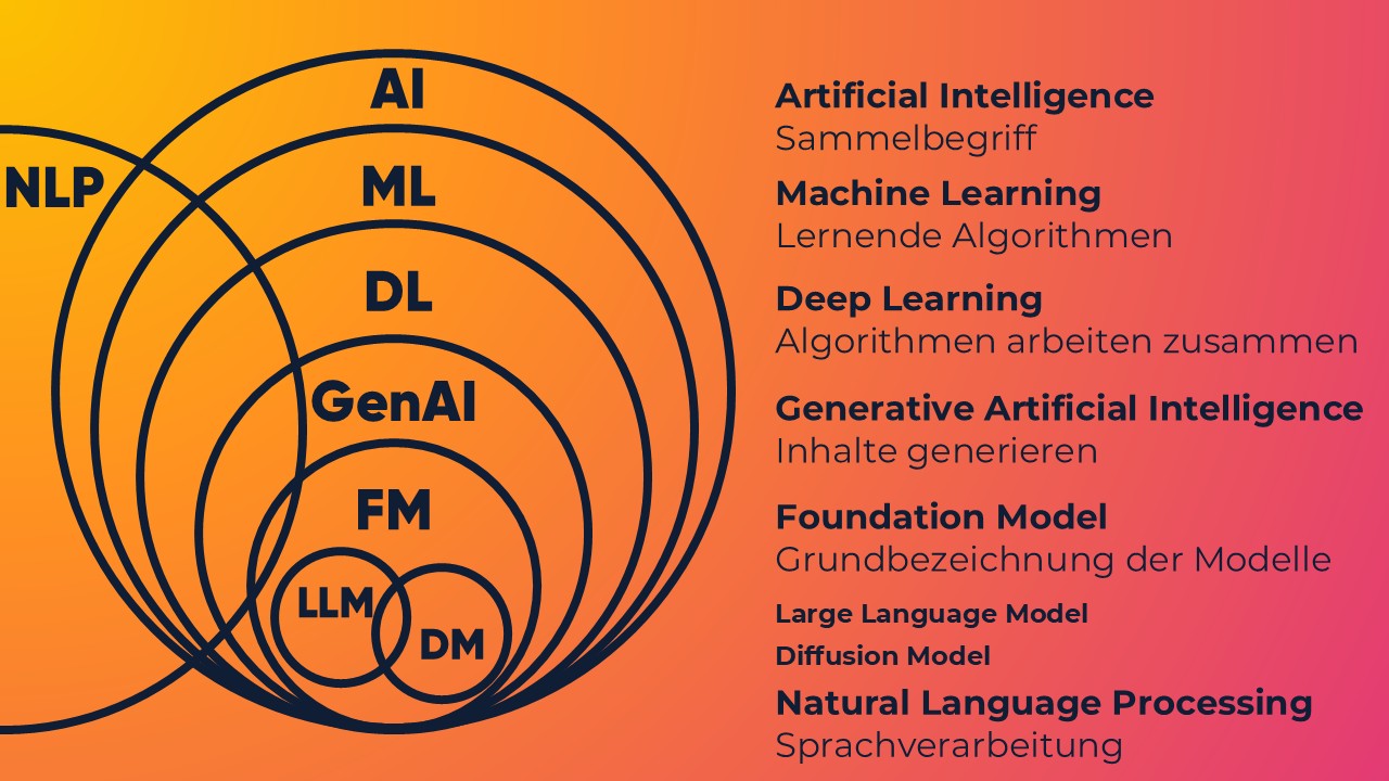 Bevor wir tiefer in die Anwendungsmöglichkeiten eintauchen, ist es wichtig, den Unterschied zwischen Künstlicher Intelligenz (KI) und generativer KI zu verstehen. KI ist ein Überbegriff für Technologien, die in der Lage sind, durch Algorithmen Daten zu verarbeiten, daraus zu lernen und auf Basis dieser Daten Entscheidungen zu treffen. Sie kommt in vielen Bereichen zum Einsatz – von der Bilderkennung bis hin zur Sprachanalyse und medizinischen Diagnosen. KI kann grosse Datenmengen analysieren, Muster erkennen und Vorhersagen treffen, aber sie agiert immer innerhalb der ihr vorgegebenen Regeln.